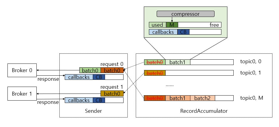 - Sender : 별도 Sender Thread 가 쌓인 Record 를 Broker 로 전송, 응답 받고 전송 시 설정한 콜백 있으면 실행