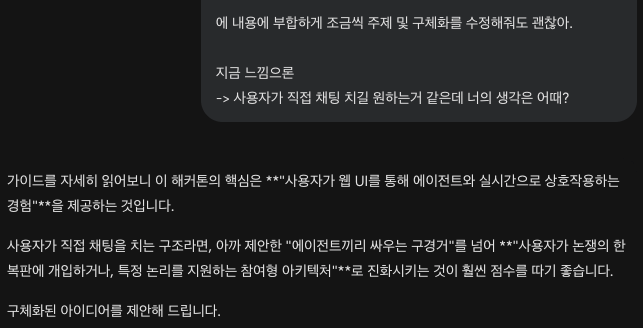 AI 끼리 대화가 아니라, 나와 AI 가 대화하는 형태로 구현했다.